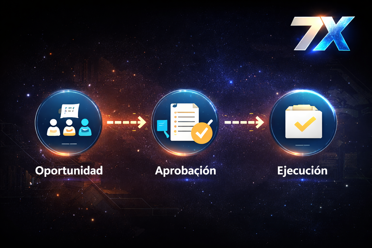 7x representa un enfoque de 7 dimensiones para ejecutar con disciplina: alcance, tiempo, costo, calidad, riesgos, comunicación y aprendizaje.